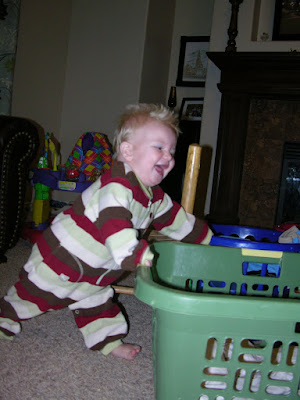 Here he is standing up again. He thought it was funny that I didn't want him pulling up on the basket of clean laundry, then he kinda fell in head first and tipped the whole thing over. Hopefully that was a lesson learned, but probably not.